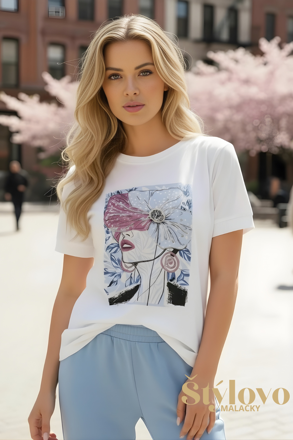 Dámske bavlnené tričko Megi Collection v bielej farbe s výrazným motívom ženy s kvetom zaujme na prvý pohľad svojím jemným a moderným dizajnom. Originálna potlač v kombinácii s príjemným materiálom robí z tohto trička ideálny kúsok na bežné nosenie aj štýlové mestské outfity.