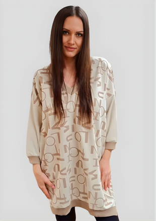 Dámska mikina MEGI v predĺženom strihu s nadčasovým abstraktným vzorom je ideálnym kúskom pre ženy, ktoré milujú štýlové a zároveň pohodlné oblečenie. Béžový podklad s tónovaným geometrickým motívom vytvára zaujímavý dizajn, ktorý sa ľahko kombinuje s legínami alebo úzkymi nohavicami. Mikina má pohodlný výstrih do „V", elastické manžety a voľný strih, vďaka čomu pristane každej postave. Skvelá voľba na bežný deň aj mestský outfit.