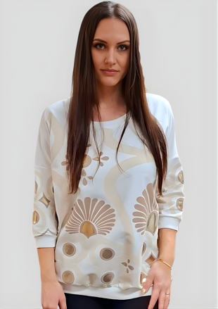 Štýlová dámska mikina značky MEGI v elegantnej bielej farbe s výraznou béžovo-zlatou potlačou zaujme na prvý pohľad. Voľný strih s 3/4 rukávmi a okrúhlym výstrihom zabezpečuje pohodlie počas celého dňa. Kvalitný elastický materiál je príjemný na nosenie a vhodný na bežné aj spoločenské príležitosti. Nadčasový dizajn s geometricko-kvetinovými prvkami dodáva mikine jedinečný ženský vzhľad.