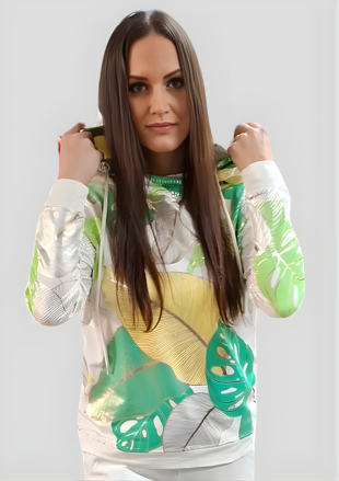 Dámska mikina značky MEGI s kapucňou prináša osviežujúci tropický dizajn plný žiarivých farieb. Kombinácia zelených, žltých a metalických listov na bielom podklade vytvára živý, letne ladený vzhľad, ktorý neunikne pozornosti. Mikina má pohodlný strih, ktorý sa skvele nosí na voľný čas, prechádzky alebo štýlové výlety. Kapucňa doplnená šnúrkami je ideálna pre chladnejšie dni. Kvalitný a priedušný materiál zabezpečuje komfort počas celého dňa.