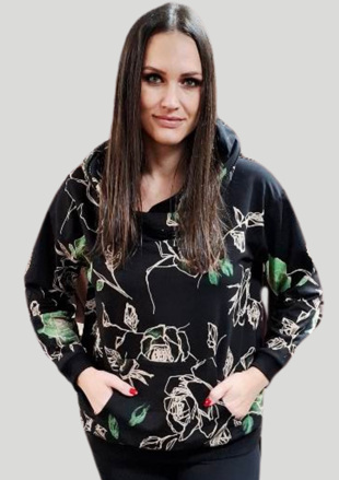 Dámska mikina MEGI COLLECTION v čiernej farbe s kvetovaným vzorom je výrazný kúsok pre všetky ženy, ktoré sa neboja zaujať. Pohodlný voľnejší strih, kapucňa a praktické klokanie vrecko z nej robia ideálnu voľbu na každodenné nosenie aj na voľný čas.