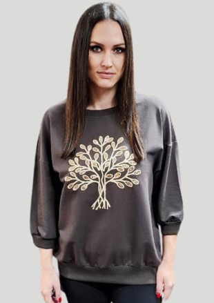 Dominantou mikiny je jemná výšivka stromu života v zlatom odtieni – symbol energie, rovnováhy a vnútornej sily.